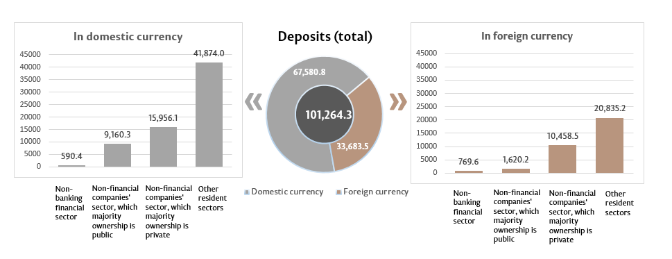 7. Deposits are structured by institutional sectors under the Instruction on completion by licensed banks of the Report on monetary statistics (Official Monitor of the Republic of Moldova No 206-215 of 2 January 2011). Other resident sectors include sectors of the households (individuals, individuals performing an activity) and non-profit institutions serving households.