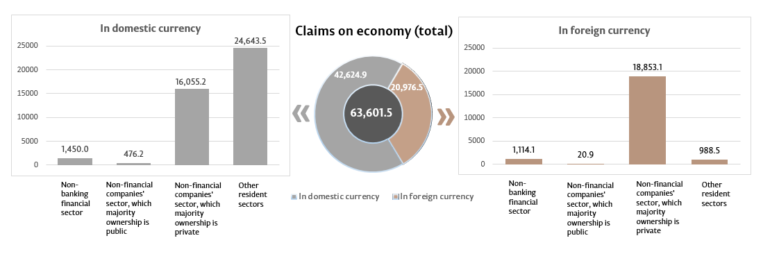 10. Claims on domestic economy represent claims of the banking system of the Republic of Moldova (including banks in the process of liquidation), in domestic and in foreign currencies, on non-financial commercial companies, which majority ownership is public or private, on other resident sectors. This indicator includes loans and borrowings (including overdue debt), overdue interest on loans; debt securities and shares; other claims.