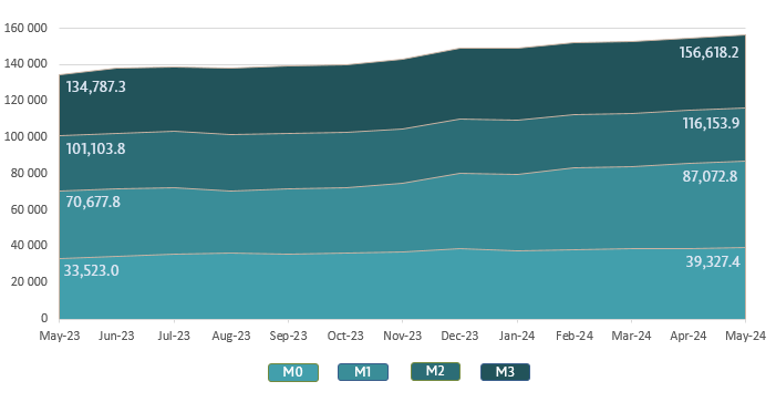 Money supply M36 increased by MDL 1,831.1 million (+1.2%) compared to April 2024 and accounted for MDL 156,618.2 million, being 16.2% higher than in the similar period of the previous year.