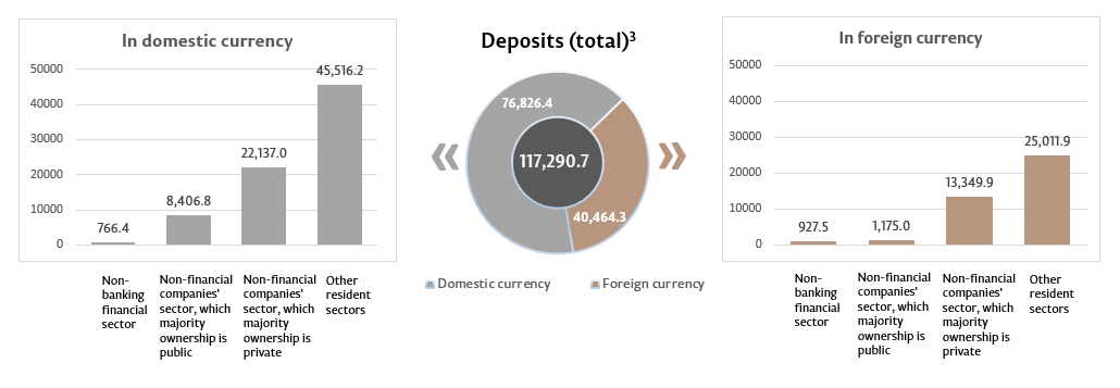 The balance of deposits in domestic currency increased by MDL 876.8 million compared to the previous month and amounted to MDL 76,826.4 million, representing a share of 65.5% of the total balance of deposits. At the same time, the balance of deposits in foreign currency (recalculated in MDL) increased by MDL 399.9 million to MDL 40,464.3 million, as compared to the previous month, having a share of 34.5% (Chart 3).