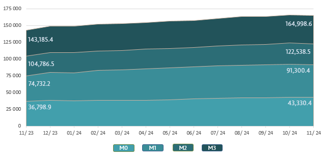 Money supply M36 decreased by MDL 813.7 million or by 0.5% compared to October 2024 and accounted for MDL 164,998.6 million, being 15.2% higher than in the similar period of the previous year.