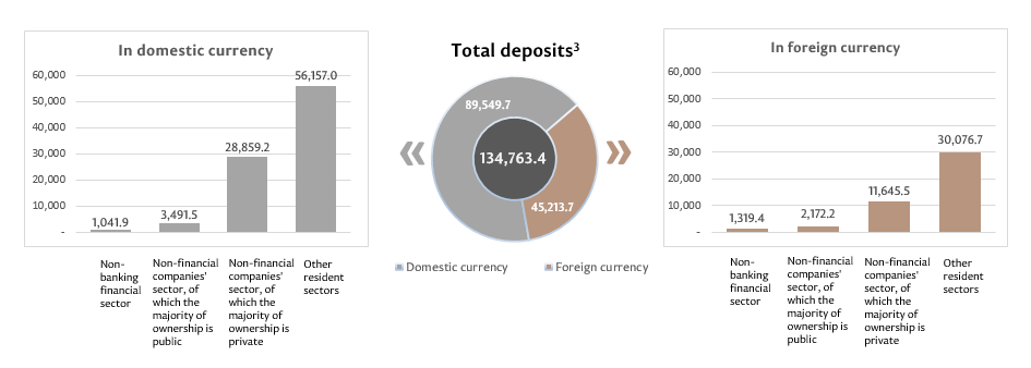 The balance of deposits in domestic currency amounted to MDL 89,549.7 million, increasing by MDL 767.2 million compared to the previous month, representing a share of 66.4% of the total balance of deposits. At the same time, the balance of deposits in foreign currency (recalculated in MDL) amounted to MDL 45,213.7 million, increasing by MDL 149.7 million compared to the previous month, representing 33.6% of the total balance of deposits (Chart 3).