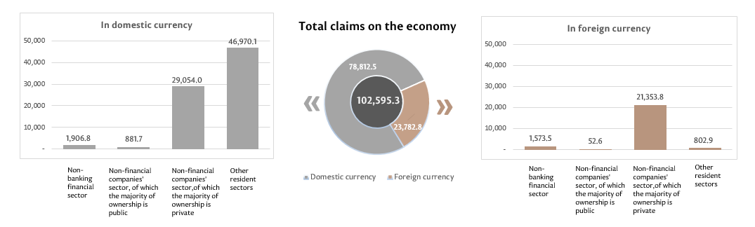 10. Claims on national economy represent the claims of the banking system of the Republic of Moldova (including banks in the process of liquidation), in domestic and in foreign currencies, on the non-banking financial sector, non-financial commercial companies, as well as on other resident sectors. This indicator includes loans and borrowings (including amounts in arrears), debt securities, shares and other claims.