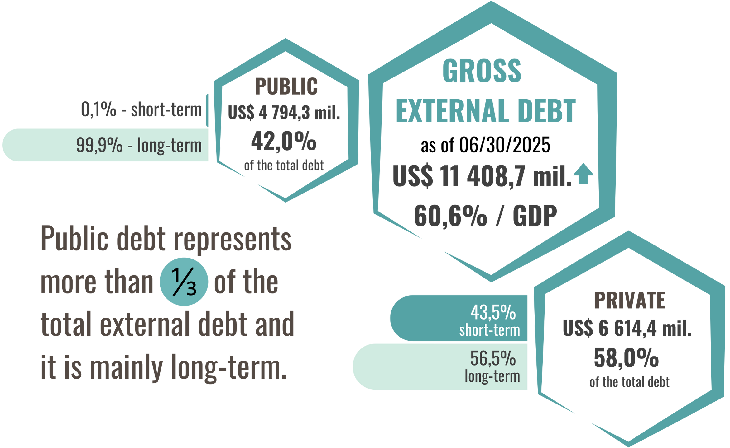 The public external debt accounted for 42,0% of the total external debt and totalled US$ 4 794,34 million (+11,1% as compared to the end of the previous year). The private external debt amounted to US$ 6 614,36 million and increased by 10,1% as compared to 12/31/2024.