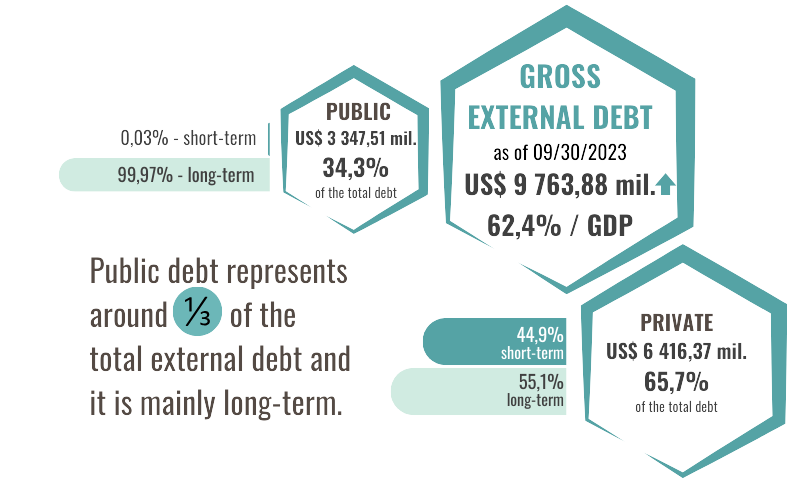 According to preliminary data, the gross external debt of the Republic of Moldova increased by 1,8% as compared to the end of 2022 and totaled 9 763,88 million as of 09/30/2023, which is 62,4% as a ratio to GDP (-3,7 p.p. as against 12/31/2022).