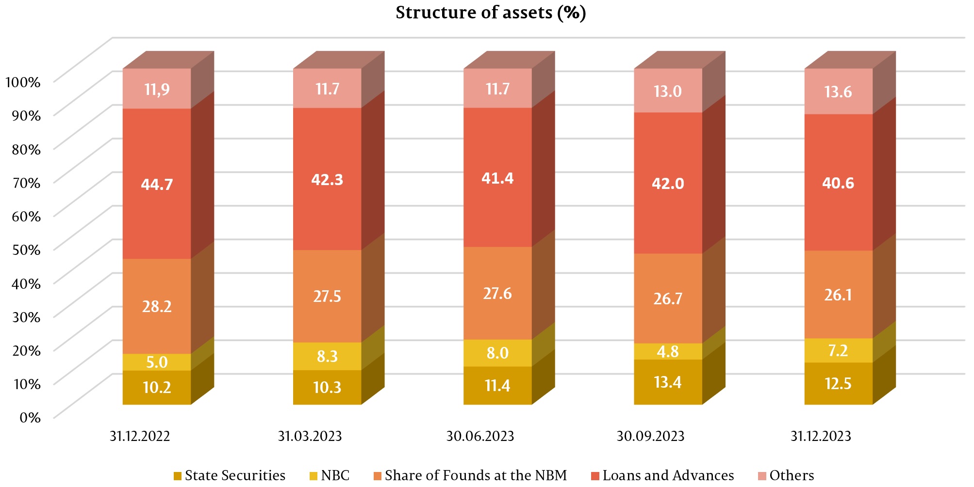 The largest share in total assets went to “Loans and advances at amortized cost” which amounted to 40,6% (MDL 62 487,1 million), decreasing by 4,1 percentage points (pp) compared to the end of the previous year.
