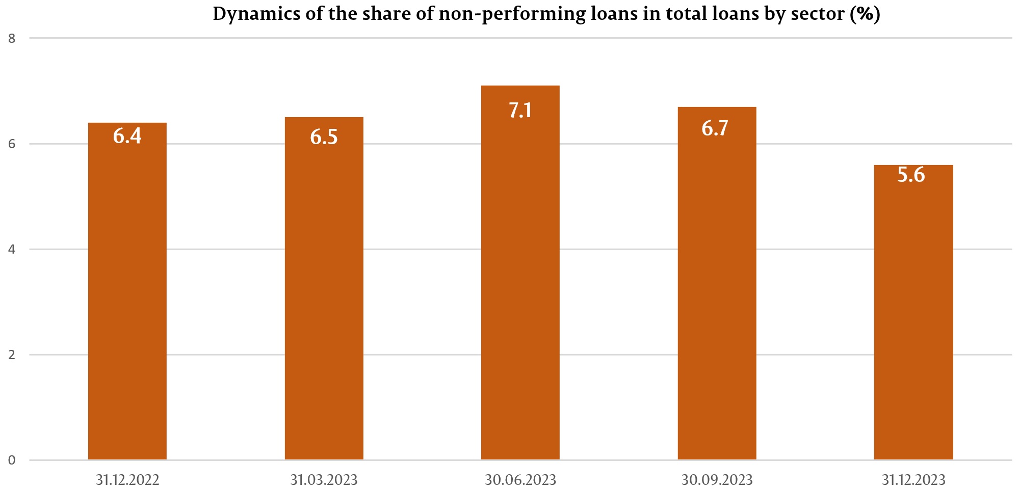 During the reference period, the share of non-performing loans (substandard, doubtful, and compromised) in total loans decreased by 0,9 pp, accounting for 5,6% on 31.12.2023, with the indicator ranging from 2,4% to 7,2%, depending on the bank.