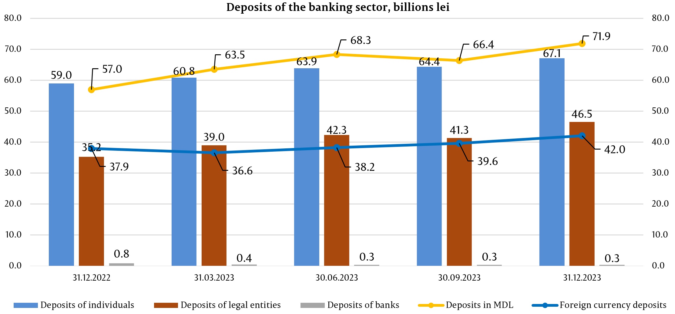 In total deposits, 63,1% went to deposits in MDL, their balance increasing by MDL       14 881,7 million (26,1%) compared to the end of the previous year and amounted to MDL 71 902,1 million on 31.12.2023. Foreign currency deposits accounted for 36,9% of total deposits, their balance increased during the reference period by MDL 4 011,1 million (10,6%), making up MDL 41 959,2 million (attracting foreign currency deposits - equivalent to MDL 6 223,4 million, negative revaluation of foreign currency deposits – MDL (-2 360,6) million).