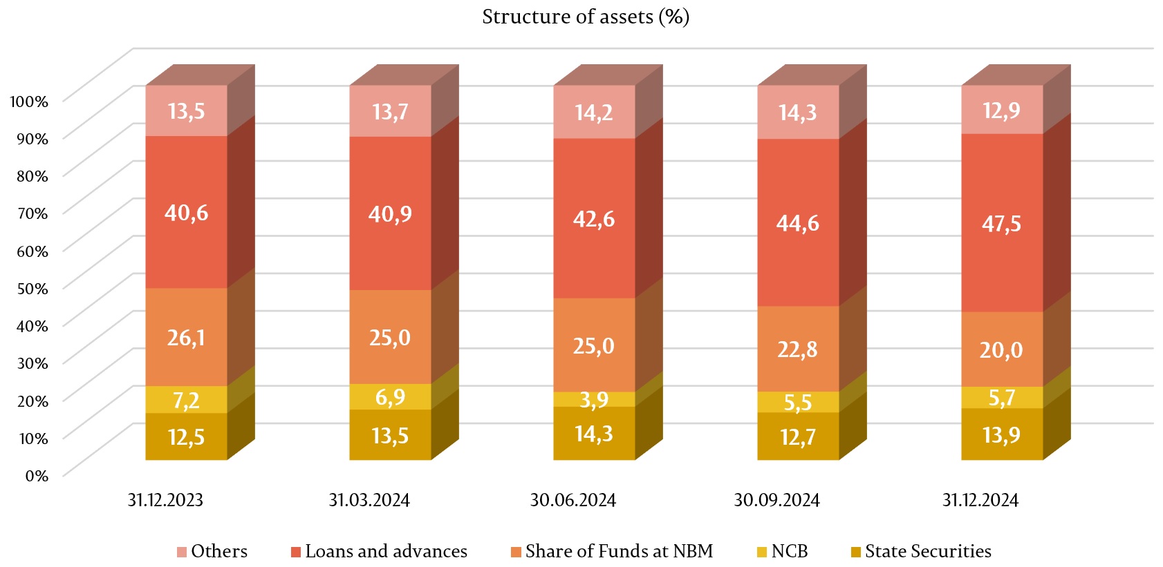In the assets structure, the largest share was held by the balance sheet item "Loans and advances at amortized cost" accounting for 47,5% (MDL 80 823,9 million), up by 6,9 percentage points (p.p.) compared to the end of the previous year. The share of funds placed with the NBM amounted to 20,0% (MDL 33 991,8 million), decreasing by 6,1 percentage points, and the share of banks' investments in government securities and National Bank certificates represented 19,6% (MDL 33 352,4 million), decreasing by 0,2 p.p. The remaining assets, which accounted for 12,9% (MDL 22 006,9 million), are held by banks in other banks, cash, tangible fixed assets, intangible assets, etc. Their share decreased by 0,6 p.p. compared to the end of 2023.