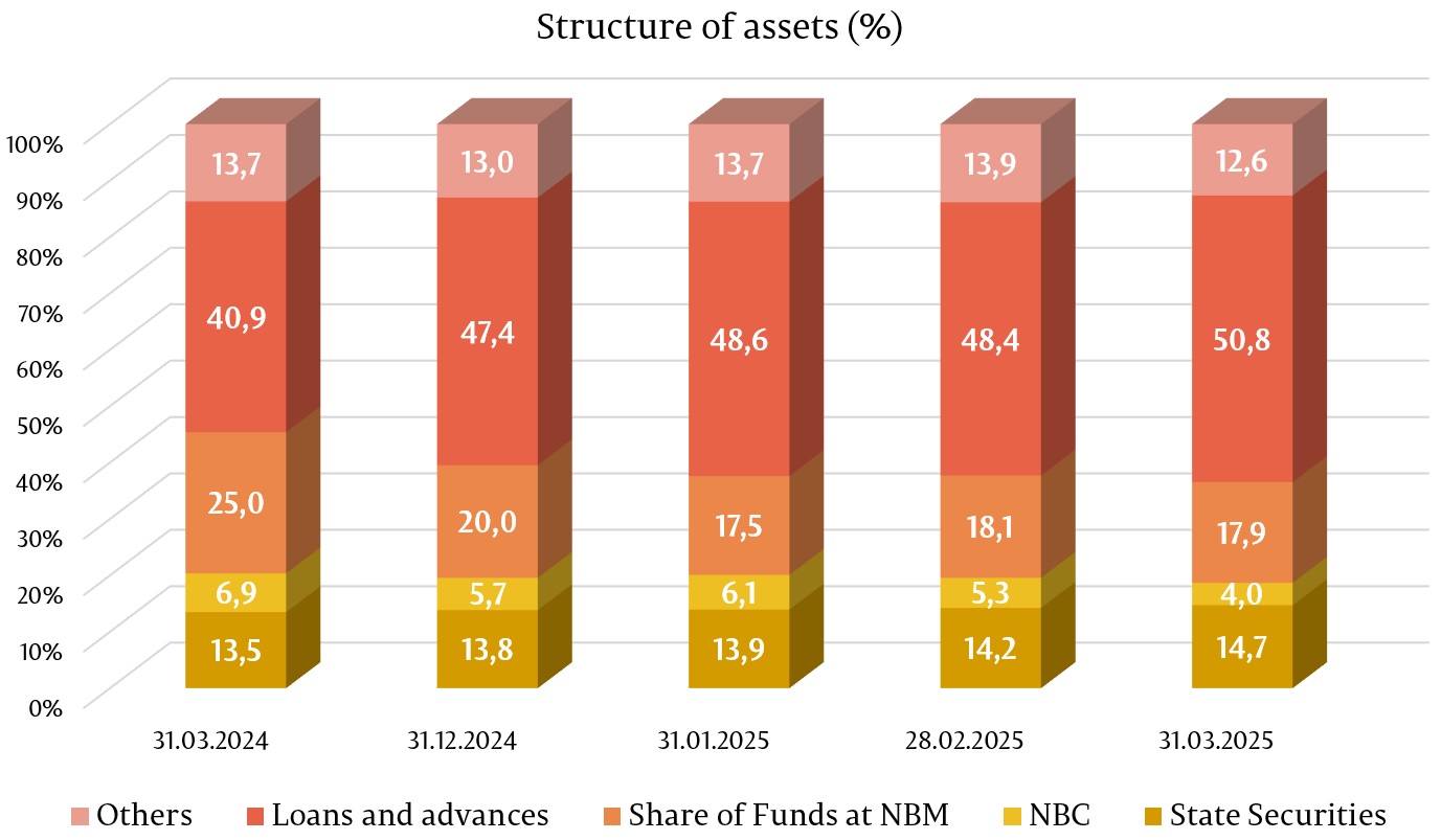 Total assets amounted to MDL 172,603.7 million, increasing by 1.3% (MDL 2,247.5 million) during the first quarter of 2025.