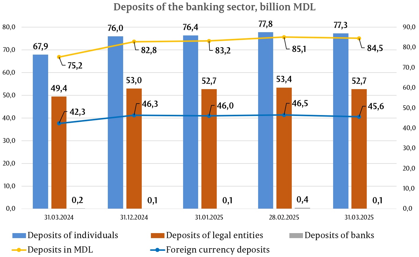 In the first quarter of 2025, the total balance of deposits increased by MDL 1,049.5 million or 0.8%, reaching MDL 130,141.3 million (deposits of individuals accounted for 59.4% of total deposits, deposits of legal entities – 40.5%, and deposits of banks – 0.1%), as a result of an increase in the balance of deposits of individuals by MDL 1,360.5 million (1.8%), to MDL 77,318.9 million, and a decrease in the balance of legal entities' deposits by MDL 296.8 million (0.6%) to MDL 52,715.2 million.