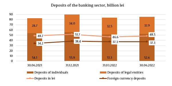 In total deposits, 56.5% returned to deposits in lei, their balance decreasing by 3.2 billion lei (6.2%) compared to the end of the previous year and amounted to 48.5 billion lei on 30.06.2022. Foreign currency deposits accounted for 43.5% of total deposits; their balance decreased during the reference period by 1.1 billion lei (2.8%), amounting to 37.3 billion lei (withdrawal of foreign currency deposits – the equivalent of 1.9 billion lei; positive revaluation of foreign currency deposits – 829.1 million lei).