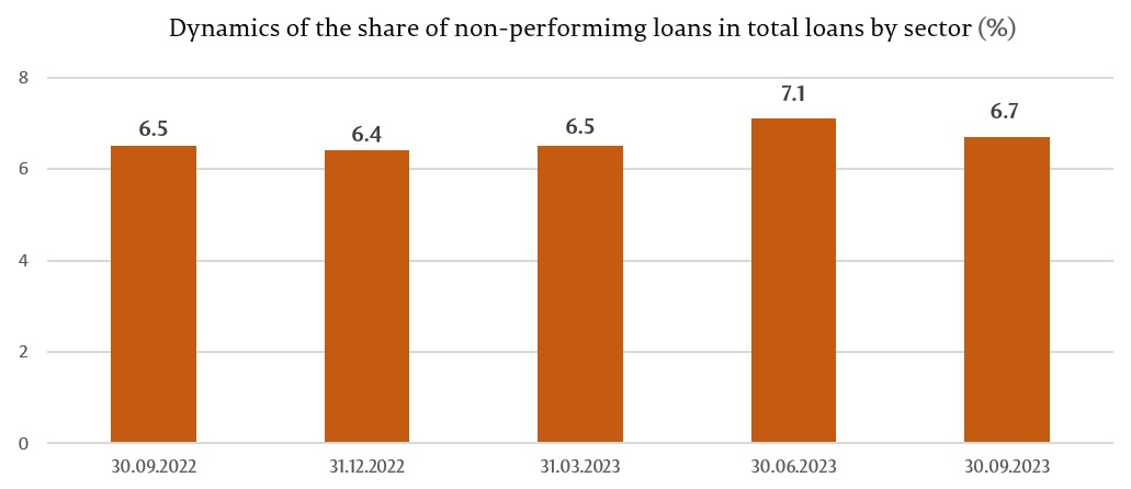 During the reference period, the share of non-performing loans (substandard, doubtful, and compromised) in total loans increased by 0.3 pp, accounting for 6.7% on September 30, 2023, with the indicator ranging from 2.4% to 8.0%, depending on the bank.