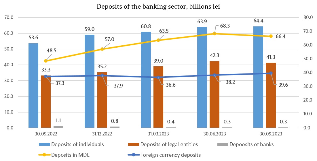 In total deposits, 62.6% were deposits in MDL, their balance increasing by MDL 9.4 billion (16.4%) compared to the end of the previous year and amounted to MDL 66.4 billion on September 30, 2023. Foreign currency deposits accounted for 37.4% of total deposits, their balance increased during the reference period by MDL 1.7 billion (4.4%), making up MDL 39.6 billion (new foreign currency deposits - equivalent to MDL 3.8 billion, negative revaluation of foreign currency deposits – MDL (-2.2) billion).