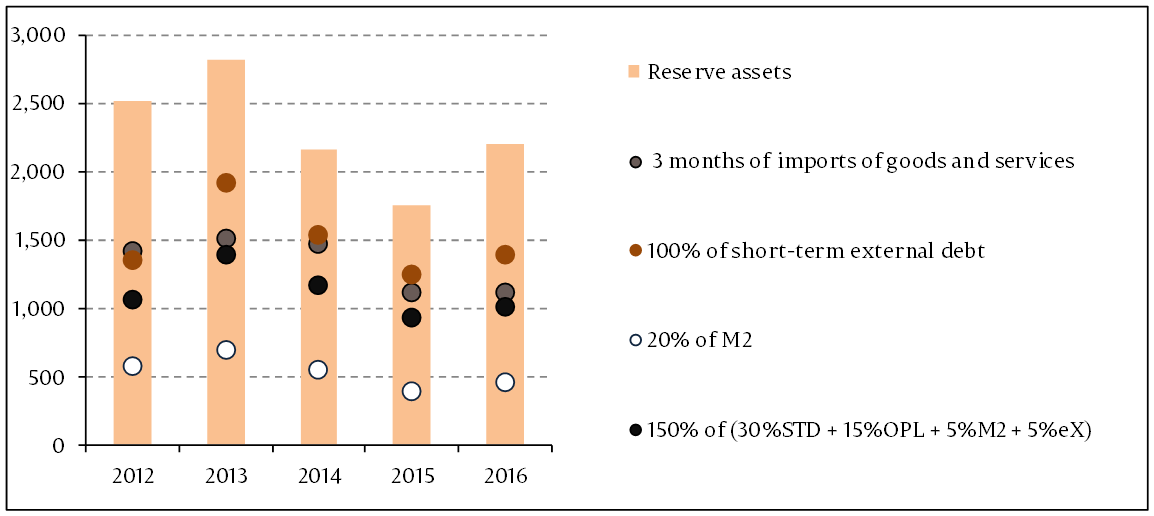 Note: STD – short-term debt, OPL – other portfolio liabilities, M2 – broad money, export-export of goods and services. Criteria based on the IMF recommendations specified in “Assessing Reserve Adequacy - Specific Proposals", April 2015: