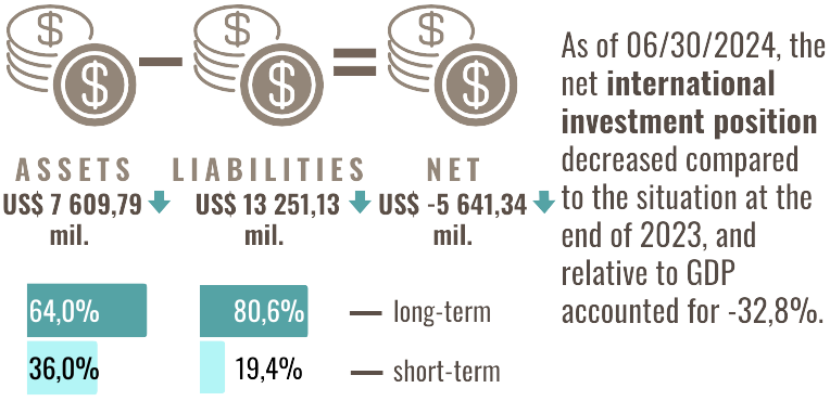 According to preliminary data, the net international investment position recorded US$ -5 641,34 million as of 06/30/2024 (or -32,8% as a ratio to GDP), 5,4% less as compared to the end of 2023.