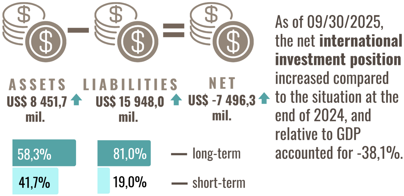 The net international investment position, as of 09/30/2025, recorded US$ -7 496,25 million and increased by 23,4%, while the ratio to GDP accounted for 38,1%, by 4,7 p.p. more as compared to the end of 2024.