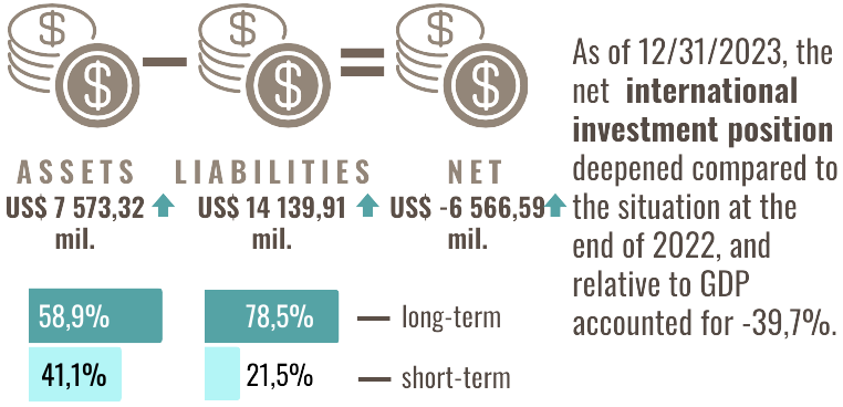 According to preliminary data, the net international investment position recorded US$ -6 566,59 million as of 12/31/2023 (or -39,7% as a ratio to GDP), 6,2% more as compared to the end of 2022.