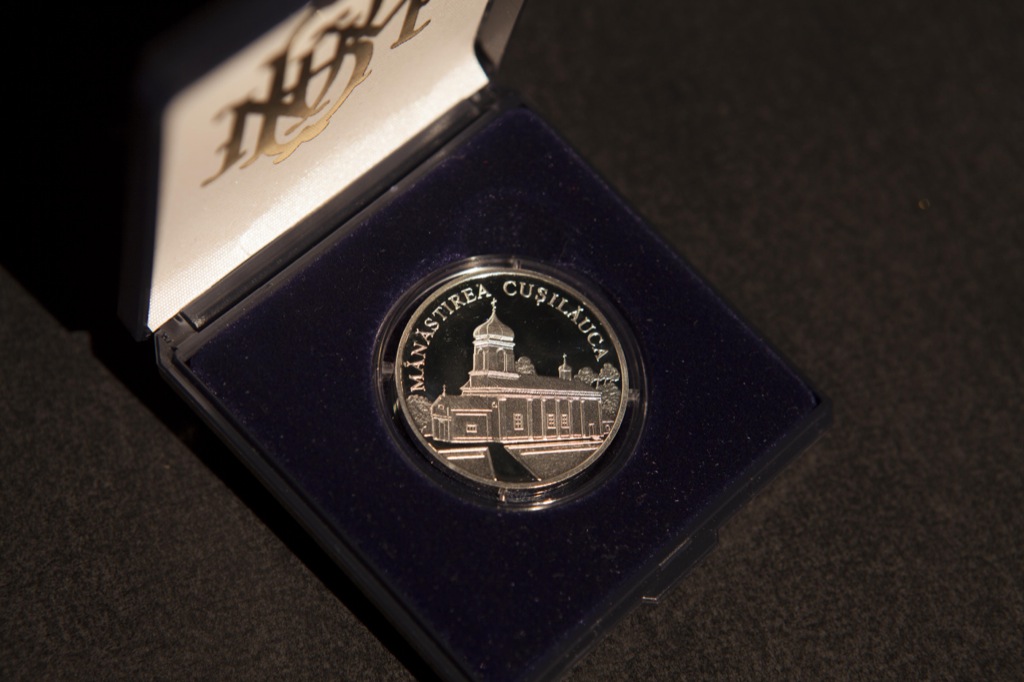 • on the upper part , following the coin circumference- the inscription "MĂNĂSTIREA CUŞILĂUCA " is engraved in block letters.