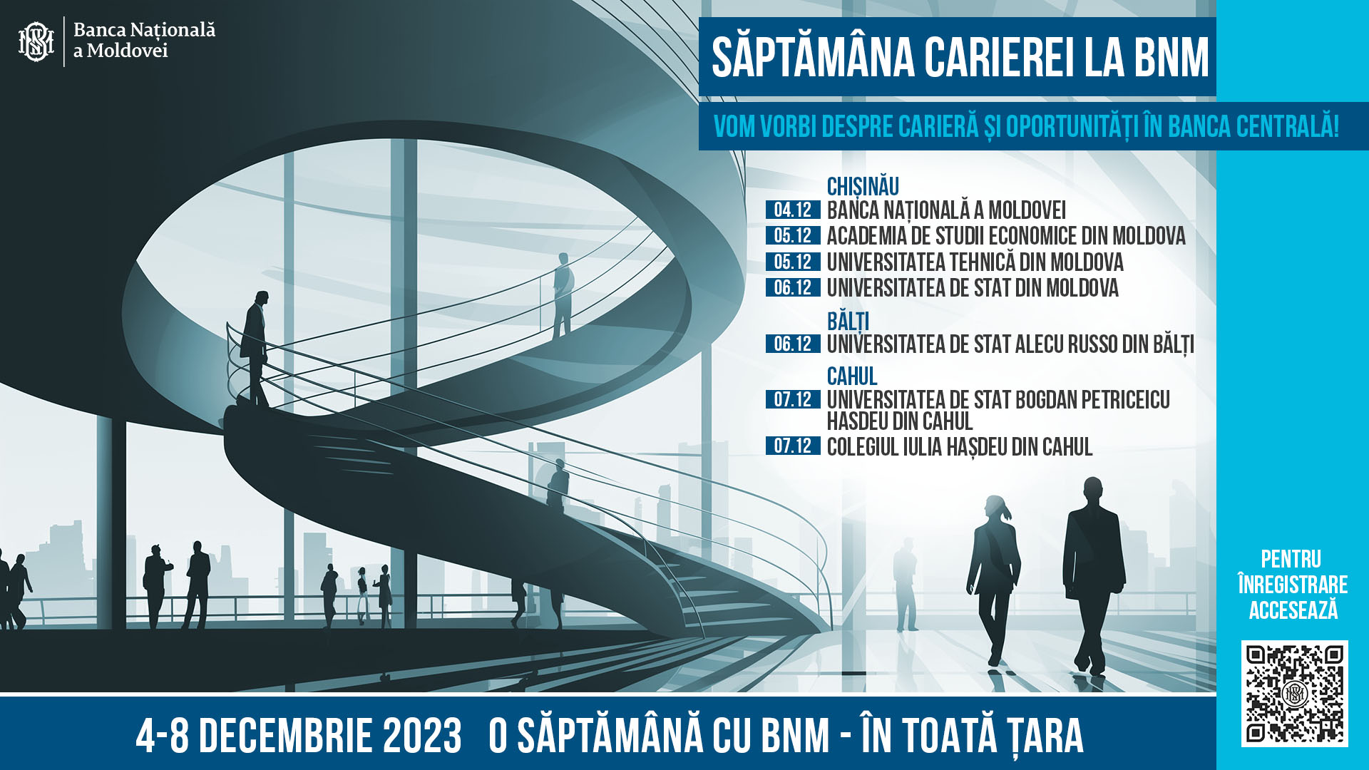 The National Bank of Moldova (NBM) is organizing, for the first time, a Career Week at the NBM, from 4 to 8 December 2023 – a major event aimed to discuss careers and opportunities in central banking.