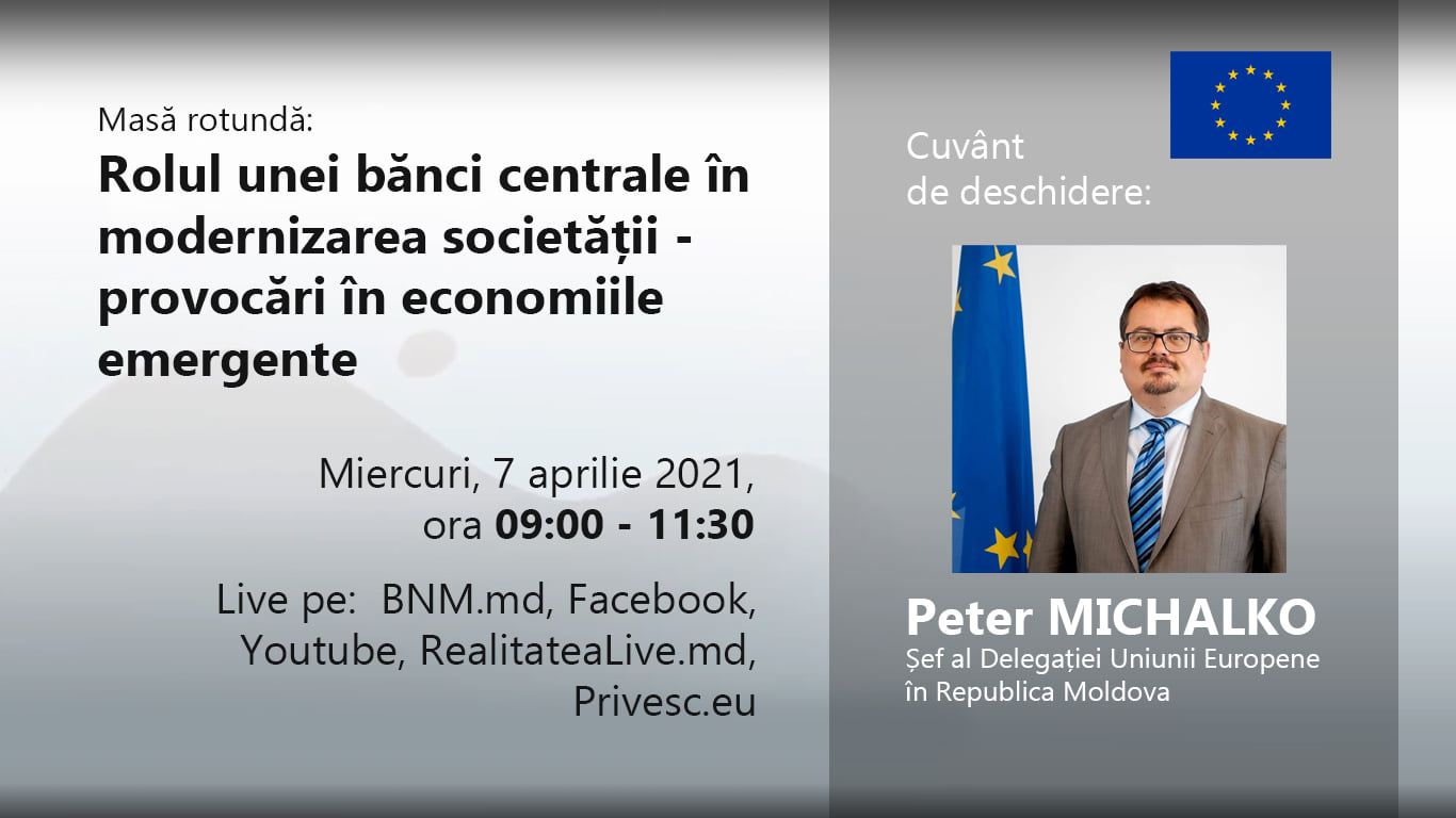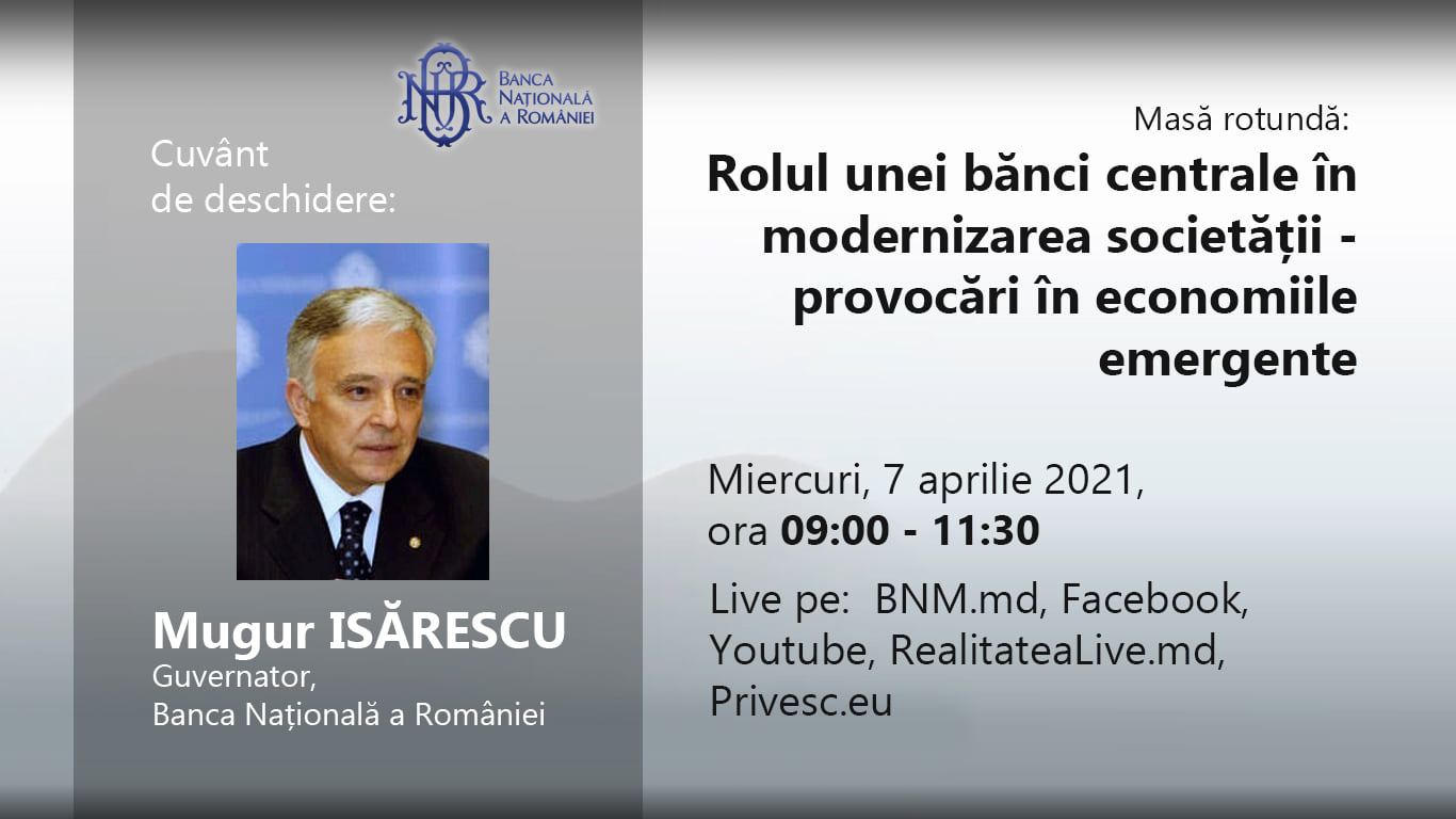 The National Bank of Moldova (NBM) in partnership with institutions representing civil society working in the field of economic analysis organize on Wednesday, 7 April a roundtable on „The role of a central bank in modernizing society - challenges in emerging economies".