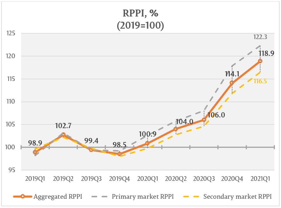 As of the end of the 1st quarter of 2021, the offer price for the residential property in Chișinău has continued the increasing trend established since the first quarter of 2020. As of the end of the reporting period, the RPPI has registered the value of 118.9 percent, which is a 4.2 percent growth compared to the previous quarter, and 17.8 percent growth compared to the 1st quarter of 2020.