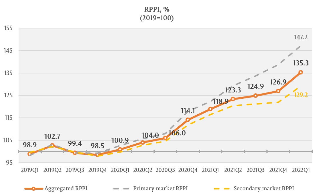 The RPPI associated to the new dwellings listed on the primary market has registered the value of 147.2 percent, that being an 8.6 percent increase compared to the 4th quarter of 2021 and a 20.4 percent increase compared to the 1st quarter of 2021.