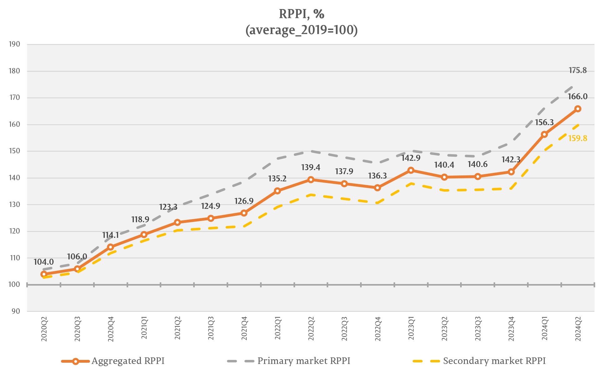 The RPPI associated to the new dwellings listed on the primary market has registered the value of 175.8 percent, that is a 5.8 percent increase compared to the 1st quarter of 2024, and a 18.3 percent increase compared to the 2nd quarter of 2023.