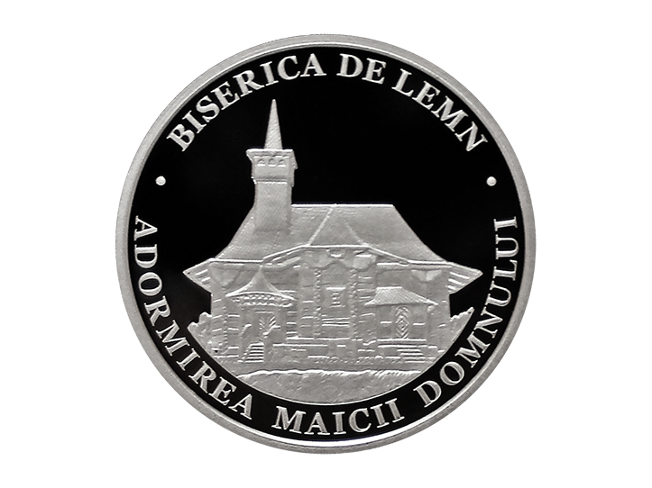 • on the ring of the coin, the inscriptions „BISERICA DE LEMN” and„ADORMIREA MAICII DOMNULUI” are engraved in block letters.