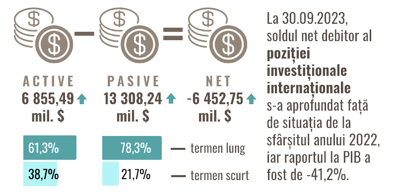 Conform datelor preliminare, poziția investițională internațională a Republicii Moldova, la 30.09.2023, a totalizat -6 452,75 mil. USD (sau -41,2 la sută raportat la PIB), soldul net debitor aprofundându-se cu 4,3 la sută, față de situația de la sfârșitul anului 2022.