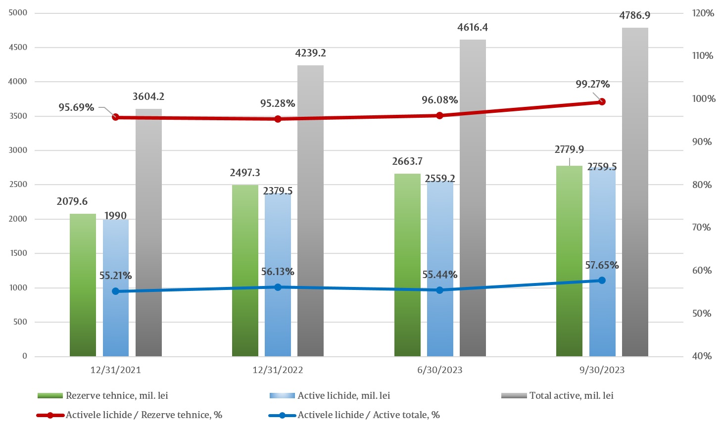 Valoarea activelor lichide a constituit 2 759,5 mil. lei, în creștere cu 7,8% față de situația din 30.06.2023, reprezentând 57,56% din activele totale înregistrate în sectorul asigurări. Societățile de asigurare dețineau active lichide pentru acoperirea a 99,27% din rezervele tehnice totale pe piață (2 779,9 mil. lei).
