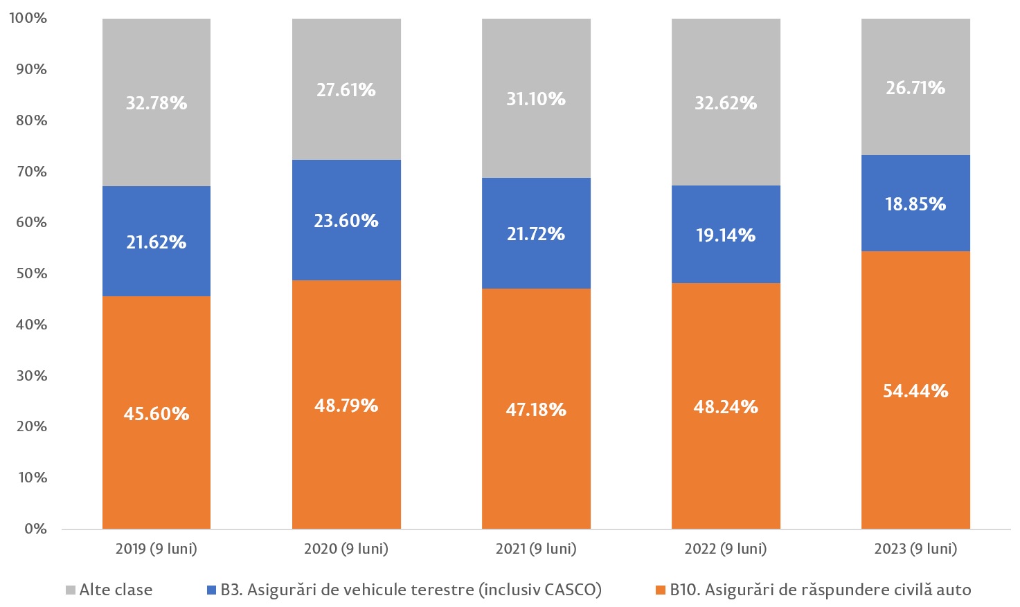 În primele 9 luni ale anului 2023, s-a menținut dependența ridicată a pieței de asigurările auto obligatorii (RCA internă și Cartea Verde), care cuprind 53,9% din primele brute subscrise, fiind înregistrat un trend crescător pe parcursul întregii perioade de raportare. Primele brute subscrise aferente asigurărilor de RCA internă au crescut cu 51,8% față de perioada similară a anului precedent, până la 789,4 mil. lei, iar primele brute subscrise pentru Carte Verde s-au majorat cu 11,5%, până la 348,4 mil. lei.