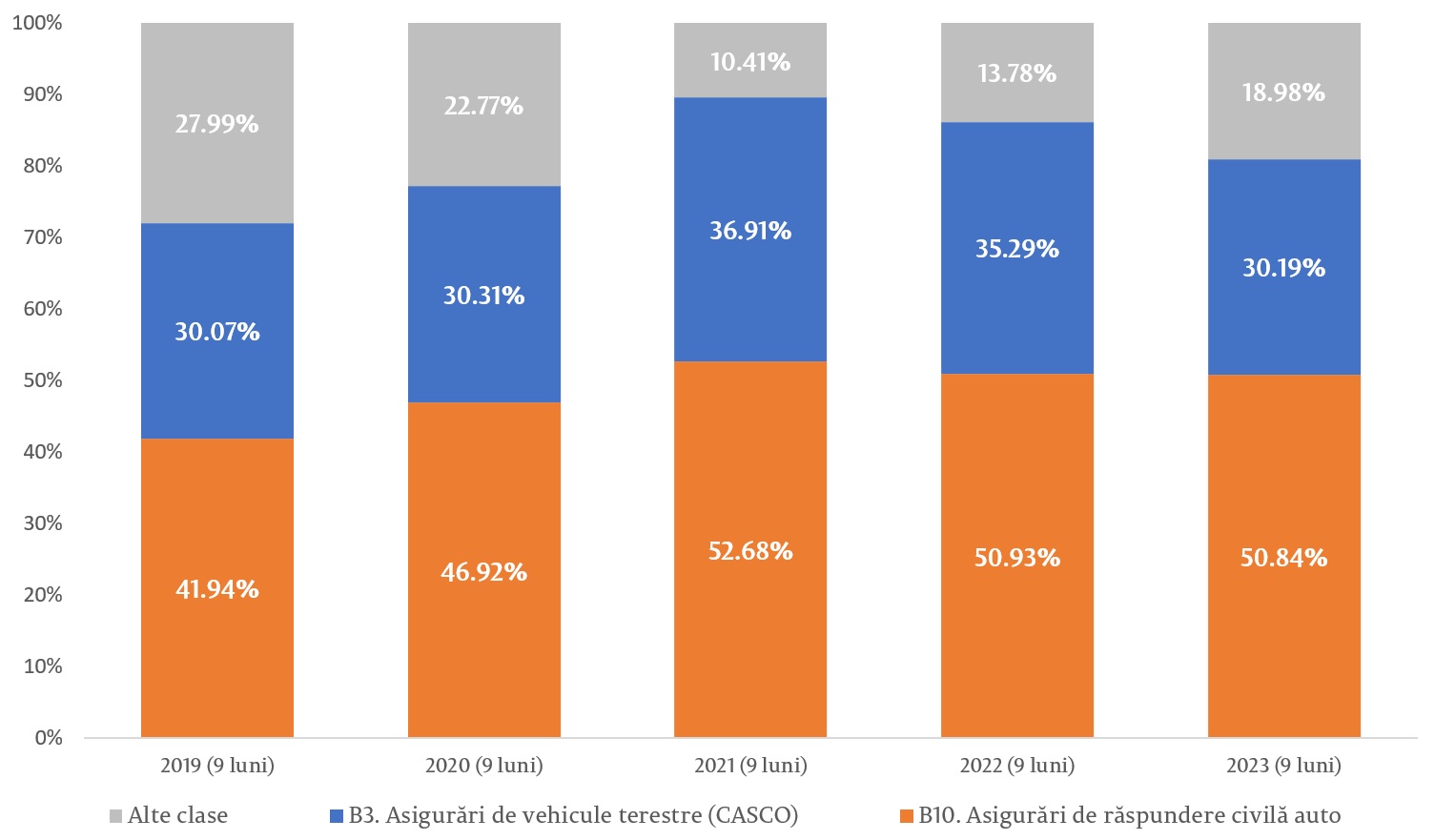Din primele brute subscrise pentru asigurări generale, cele mai mari ponderi le dețin clasele: Asigurările obligatorii de răspundere civilă auto (RCA internă, Carte Verde, Carnet TIR, Carnet CMR) și Asigurările de vehicule terestre, altele decât cele feroviare (CASCO), care cuprind 73,3% din piață, celelalte clase de asigurări cumulând 6,7%.