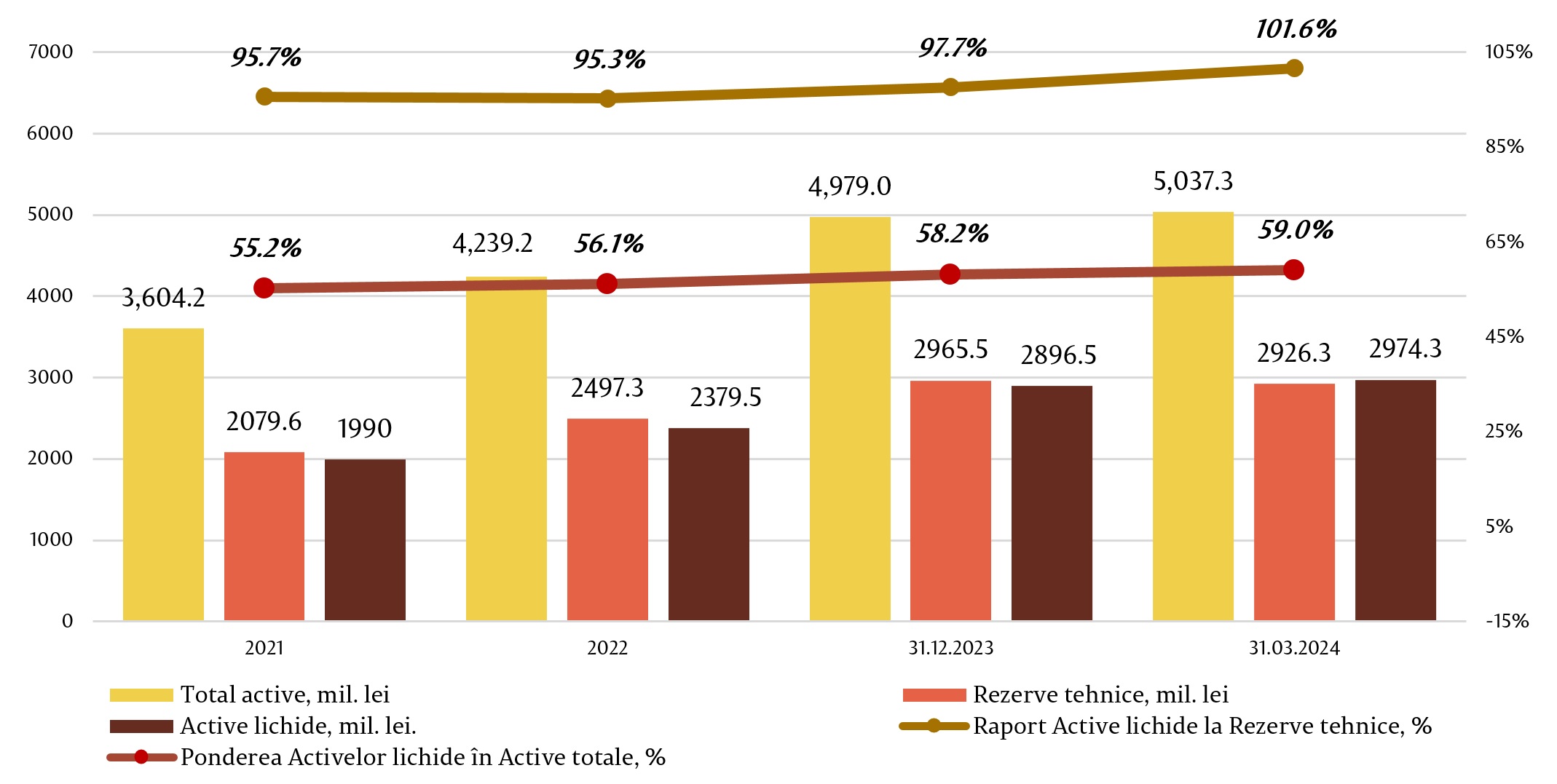 Activele totale ale societăților de asigurare au înregistrat la 31.03.2024 o valoare de 5 037,3 milioane lei, în creștere cu 58,3 milioane lei sau 1,2 la sută față de sfârșitul anului precedent. Valoarea activelor lichide a constituit 2 974,3 milioane lei, în creștere cu 2,7 la sută față de situația din 31.12.2023, ceea ce reprezintă 59 la sută din activele totale înregistrate de către societățile de asigurare. Valoarea activelor lichide raportată la valoarea rezervelor tehnice totale pe piață a fost de 101,6 la sută, în creștere cu 3,9 puncte procentuale față de sfârșitul trimestrului precedent.