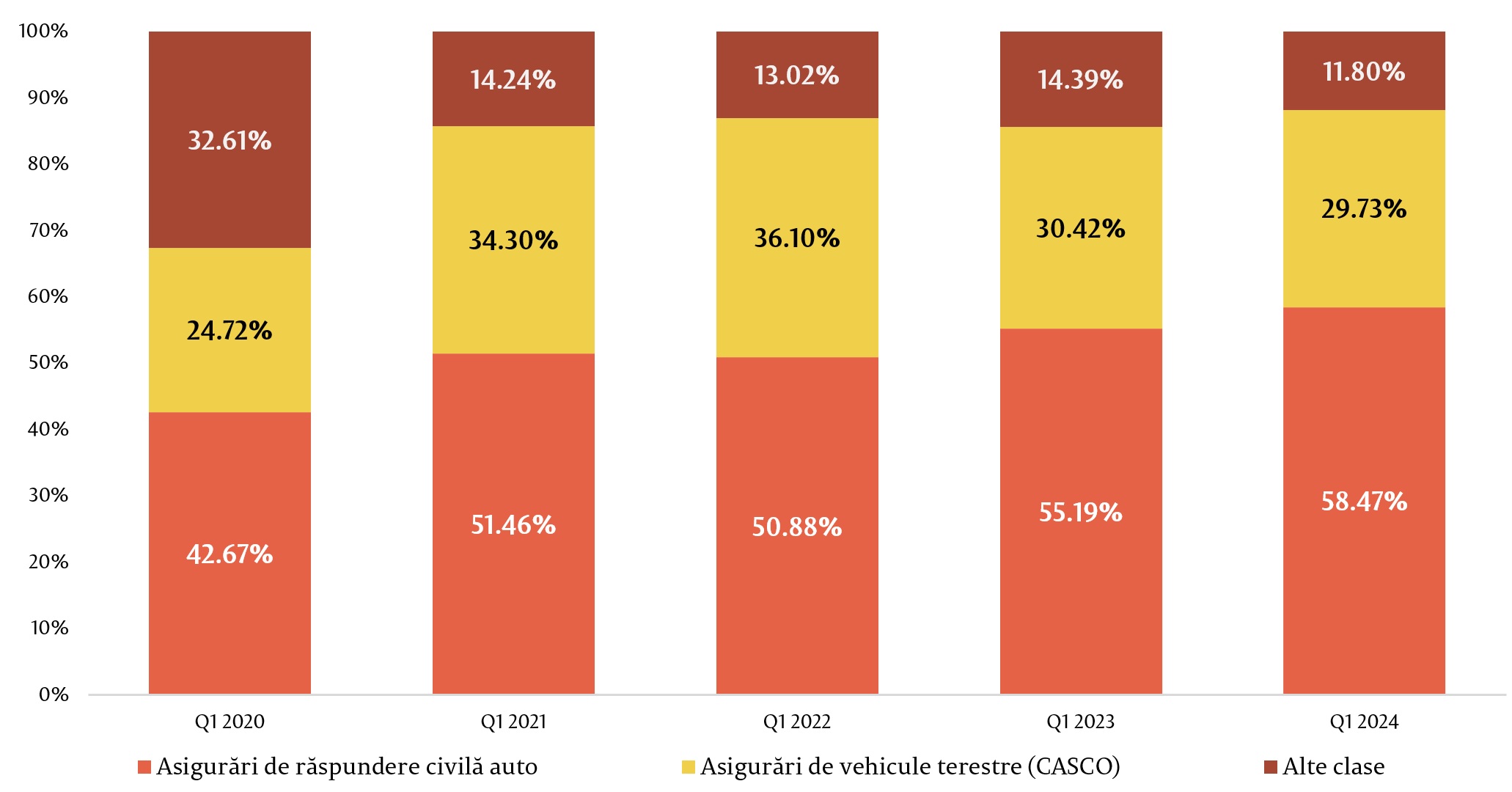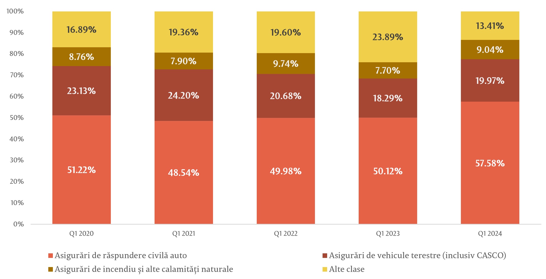 În totalul primelor brute subscrise pentru asigurările generale, cele mai mari ponderi le-au deținut clasele Asigurările obligatorii de răspundere civilă auto (care cuprinde RCA internă, Carte Verde, Carnet TIR, Carnet CMR), Asigurările de vehicule terestre, altele decât cele feroviare (CASCO) și Asigurările de incendiu și alte calamități naturale, cumulând peste 86,6 la sută din piață. Celelalte clase de asigurări cuprind fiecare mai puțin de 30 milioane lei sau 4,7 la sută fiecare.