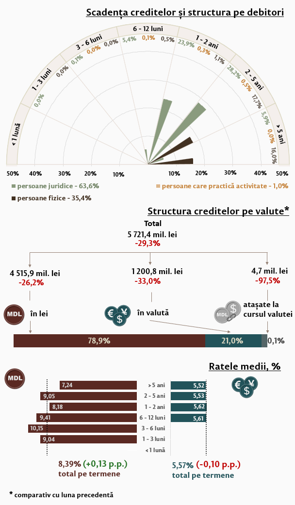 Rata medie la creditele de consum acordate în moneda națională s-a diminuat cu 0,04 p.p. și a constituit 10,53 la sută. Rata medie la creditele imobiliare acordate în moneda națională s-a majorat cu 0,05 p.p., constituind 7,04 la sută.