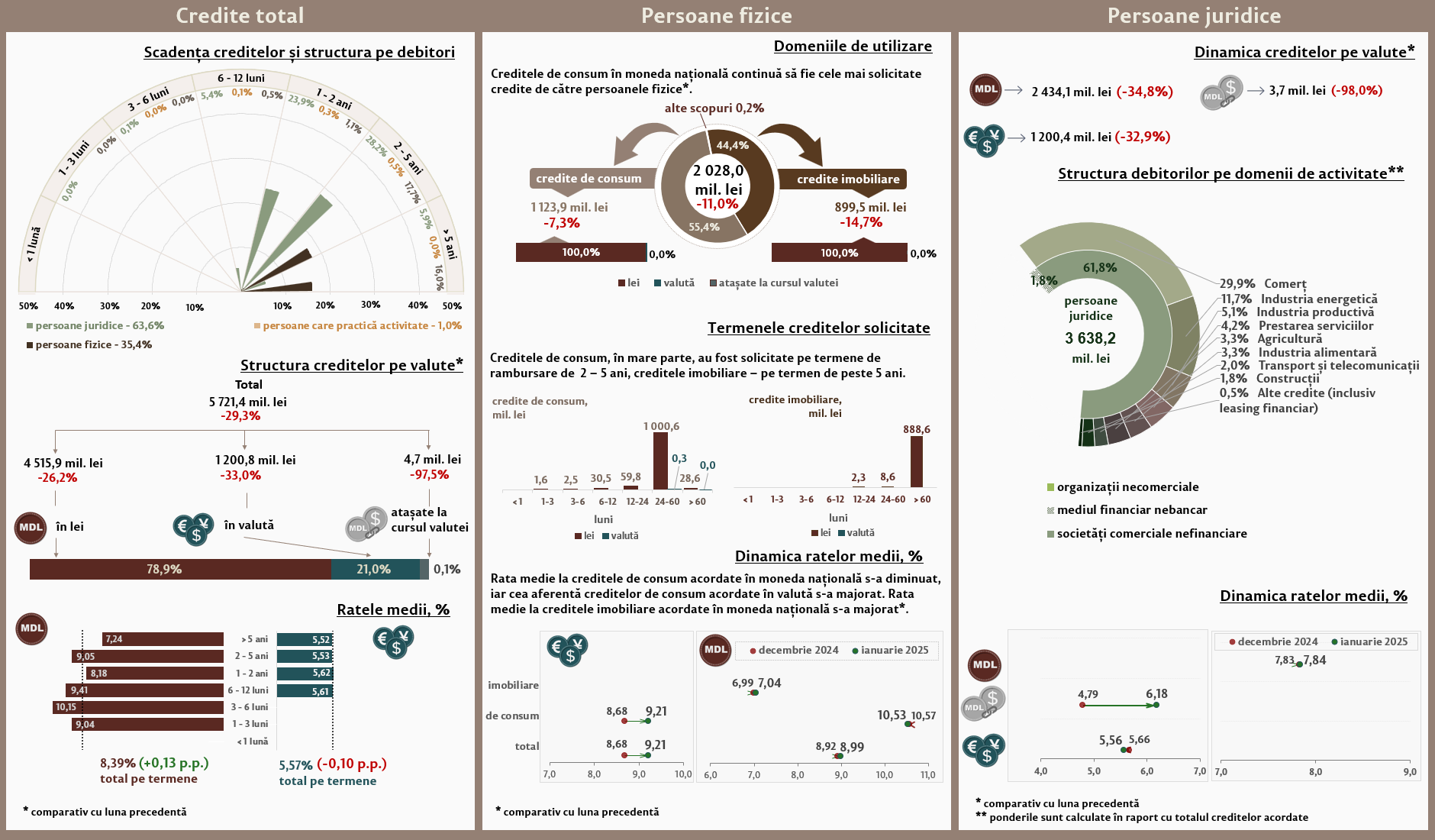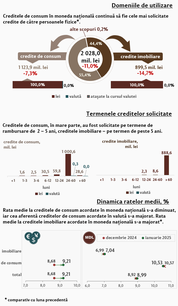 Persoanele fizice au contractat în luna ianuarie 2025 credite în volum de 2 028,0 milioane lei (Infografic 2), în descreștere cu 11,0 la sută față de luna precedentă, partea majoră (55,4 la sută) fiind acordată pentru consum. Majoritatea creditelor de consum acordate persoanelor fizice (1 000,6 milioane lei) au fost contractate în moneda națională pe termene de la 2 până la 5 ani.