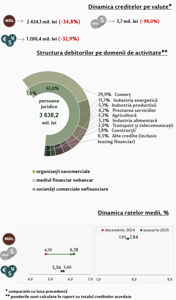 Rata medie la creditele acordate persoanelor juridice în moneda națională s-a majorat cu 0,01 p.p., până la nivelul de 7,84 la sută. În același timp, rata medie la creditele acordate în valută s-a diminuat cu 0,10 p.p. și a constituit 5,56 la sută.
