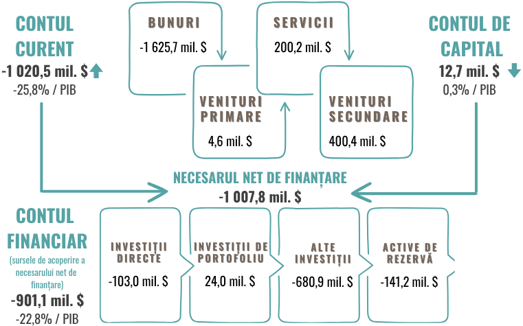 Conform datelor preliminare, în trimestrul I 2025, deficitul contului curent al balanței de plăți a Republicii Moldova a totalizat -1 020,50 mil. USD și s-a majorat de 2,3 ori comparativ cu perioada similară a anului 2024, pe seama creșterii deficitului comerțului exterior cu bunuri, concomitent cu diminuarea excedentelor înregistrate de veniturile primare și a soldului pozitiv a balanței serviciilor. În același timp, excedentul veniturilor secundare s-a majorat cu 14,0 la sută, insuficient pentru acoperirea impactului celorlalte componente ale contului curent Raportul dintre deficitul contului curent și PIB a fost de -25,8 la sută, cu 14,2 p.p. mai mare față de cel consemnat în trimestrul I 2024.