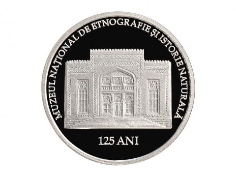 Following the coin circumference – the inscriptions „MUZEUL NAŢIONAL DE ETNOGRAFIE ŞI ISTORIE NATURALĂ” and „125 ANI” are engraved in block letters.