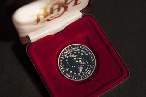 on the upper part, following the coin circumference the inscriptions“PROCLAMAREA INDEPENDENŢEI” , “DIN EUROPA SPRE EUROPA” are engraved in block letters;