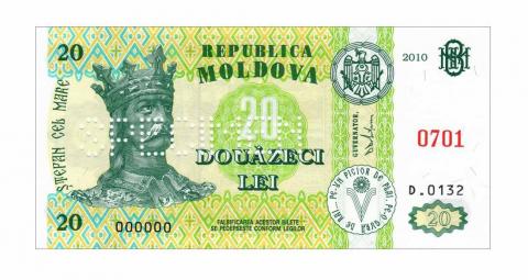 The front side of the banknote: The Coat of Arms of the Republic of Moldova, the inscription "REPUBLICA MOLDOVA", the portrait of Ştefan cel Mare, a national multicolour ornament, two vertical decorative elements, the central rosette, the nominal value written in figures and words, the abbreviation "BNM", the facsimile " GUVERNATOR, D. Drăguţanu", the circle wording "PE-UN PICIOR DE PLAI, PE-O GURĂ DE RAI...", Victory Token - "V", the year of banknote issuance "2010", the banknote number and series, the inscription "FALSIFICAREA ACESTOR BILETE SE PEDEPSEŞTE CONFORM LEGILOR". |