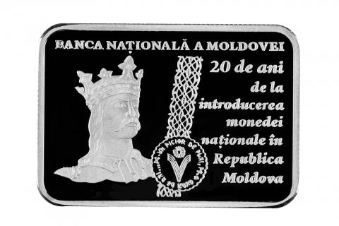 on the right side the inscription „20 de ani de la introducerea monedei naţionale în Republica Moldova” is engraved.