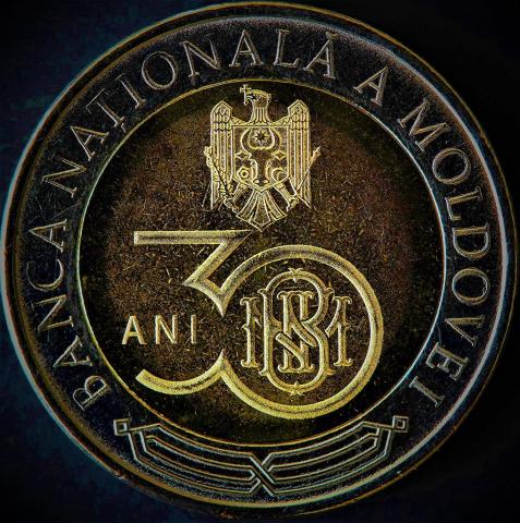 in the foreground – stylized image of the number "30" with the logo of the National Bank of Moldova and the inscription "ANI";