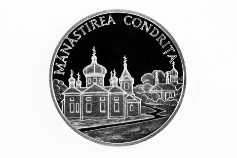 on the upper part , following the coin circumference- the inscription "MĂNĂSTIREA CONDRIŢA" is engraved in block letters.