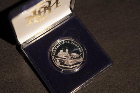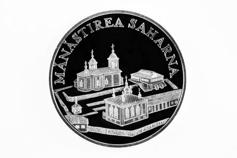 on the upper part , following the coin circumference- the inscription "MĂNĂSTIREA SAHARNA" is engraved in block letters.