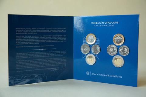 The mint set is issued in the form of a booklet, fixed into a cardboard box, which consists of two metal coins in use with the face value of MDL 1, 2, 5 and 10 . The set is sealed in transparent blister packs made of plastic.