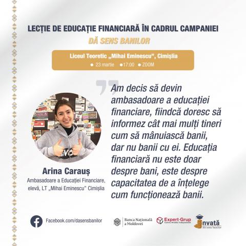 "Financial education is not just about money, it's about the ability to understand how money works", mentions Arina Carauș, student of the Theoretical High School "Mihai Eminescu" from Cimișlia.