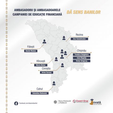 Pupils and students from six districts and municipalities of the Republic of Moldova will learn in the coming days how to make sense of money, in online public lessons given by eight ambassadors of financial education. They were selected following a public competition [1] and trained in the project "Give sense to money", carried out by the National Bank of Moldova (NBM) and the Independent Analytical Center "Expert-Grup".