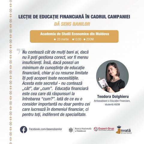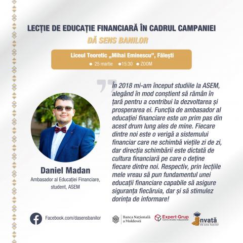 This week's series of lessons will be concluded by Daniel Madan, who is a student at ASEM, but will organize training for his former colleagues from the Theoretical High School "Mihai Eminescu" from Falesti. "In 2018, I started my studies at ASEM, consciously choosing to stay in the country to contribute to its development and prosperity. The position of ambassador of financial education is a first step in this long journey I have chosen. Each of us is a link in the financial system that changes our lives every day, but the direction of change is dictated by the financial culture that each of us has. Respectively, through my lessons I want to lay the foundation of a financial education capable of giving security to everyone, but also to stimulate the desire for information", says Daniel.